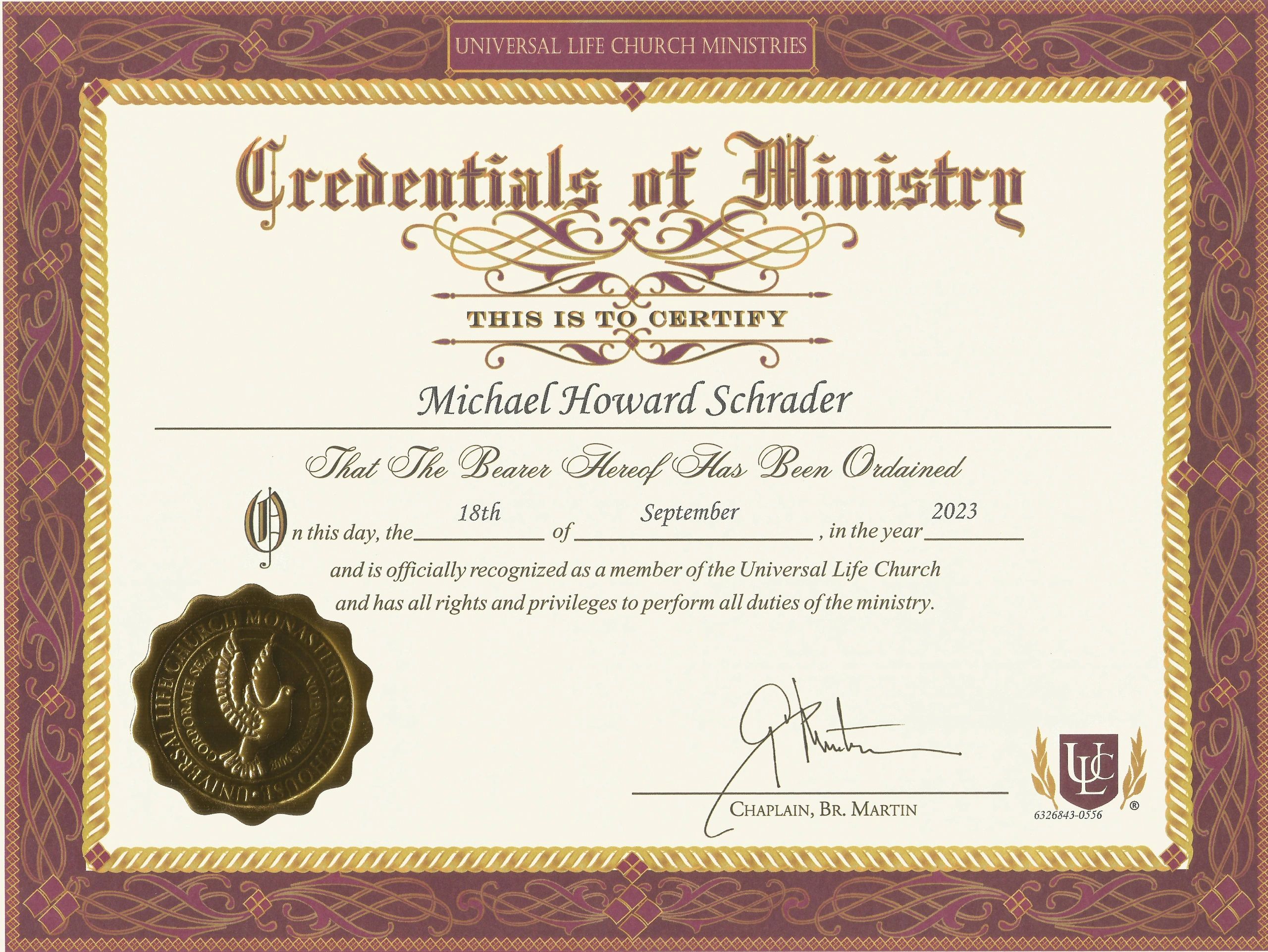 I have a Ph.D. from Wayne State University and am an ordained minister of the non-denominational Universal Life Church.